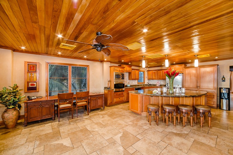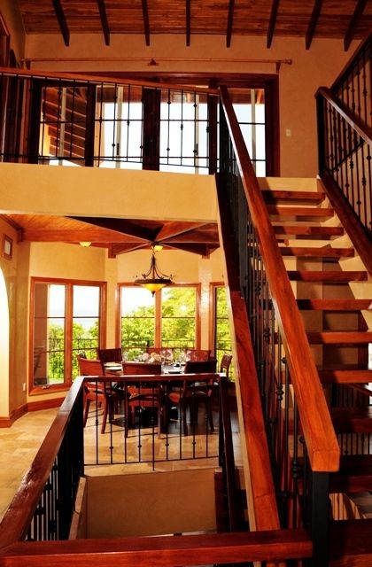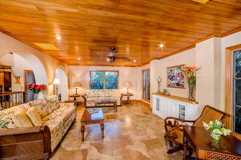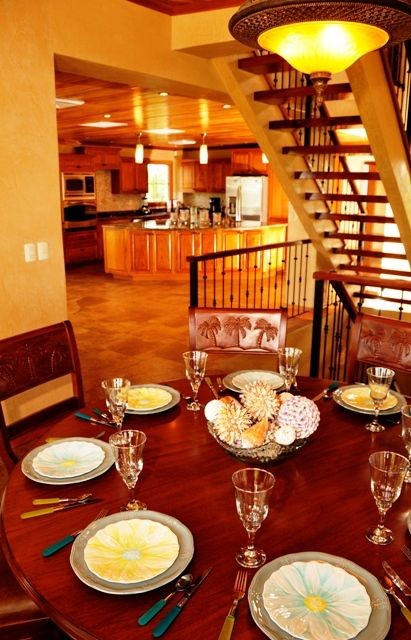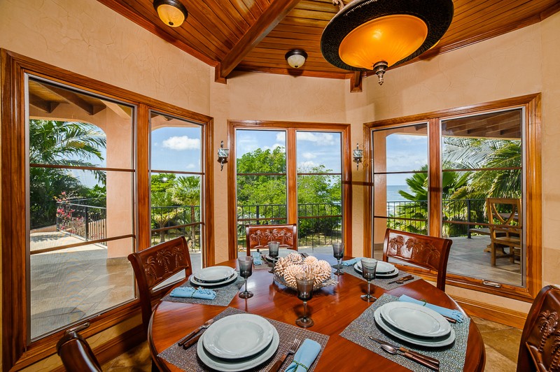 Head up the wood and iron staircase, with oversized chandelier, to the second floor which has the main living area and half bath. The dining area is surrounded by windows looking out onto the patio and ocean beyond.
