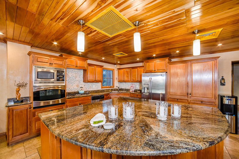 The kitchen spares no expense to meet your needs. Gas cook top, wall oven, microwave, side by side refrigerator, dishwasher, plus an extra refrigerator make this kitchen well-appointed for any size group. Custom cabinets, granite countertops, tile backsplash, and an oversized island complete this fantastic kitchen. The second level also has a mountain view bedroom with full bath featuring a tile tub.
