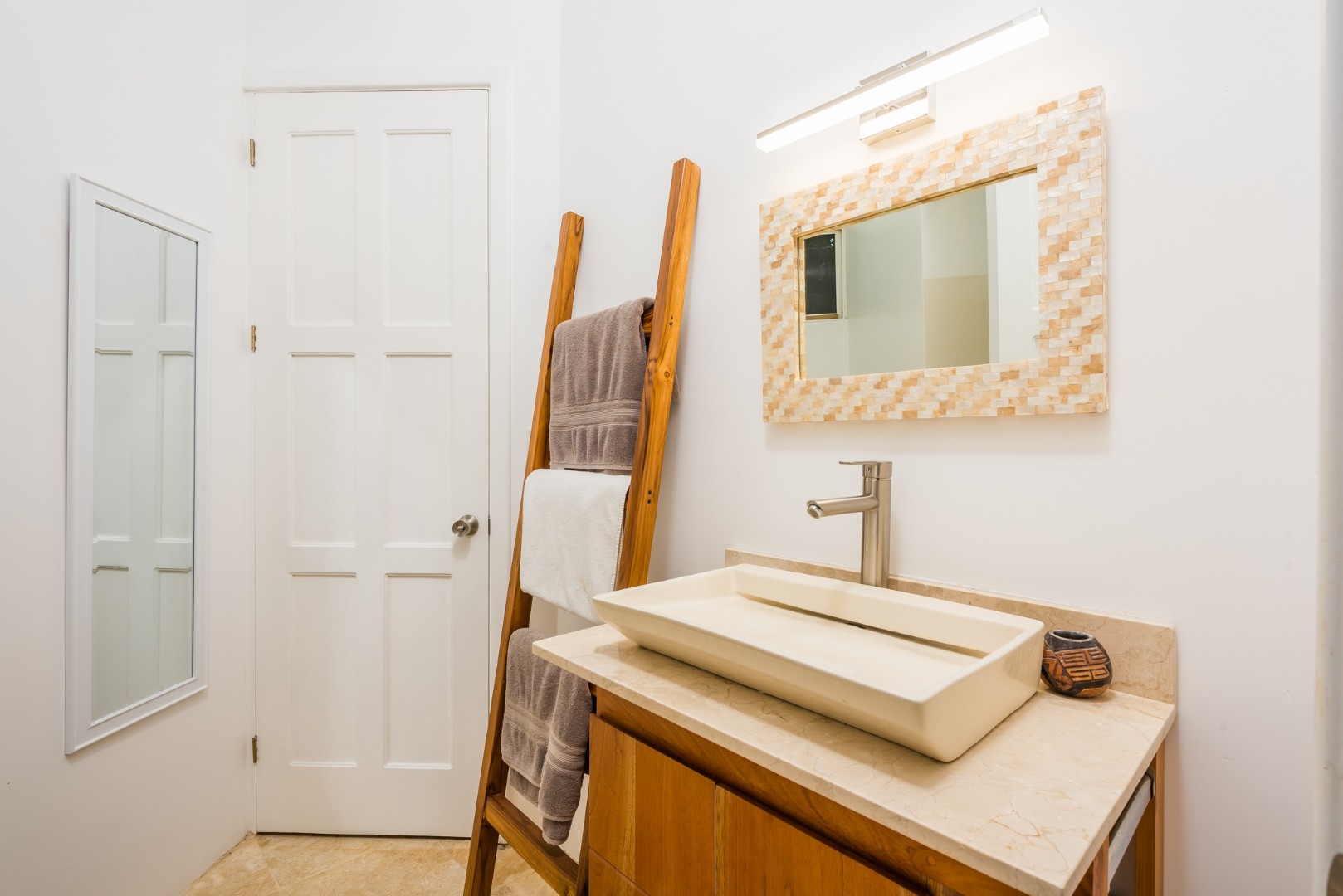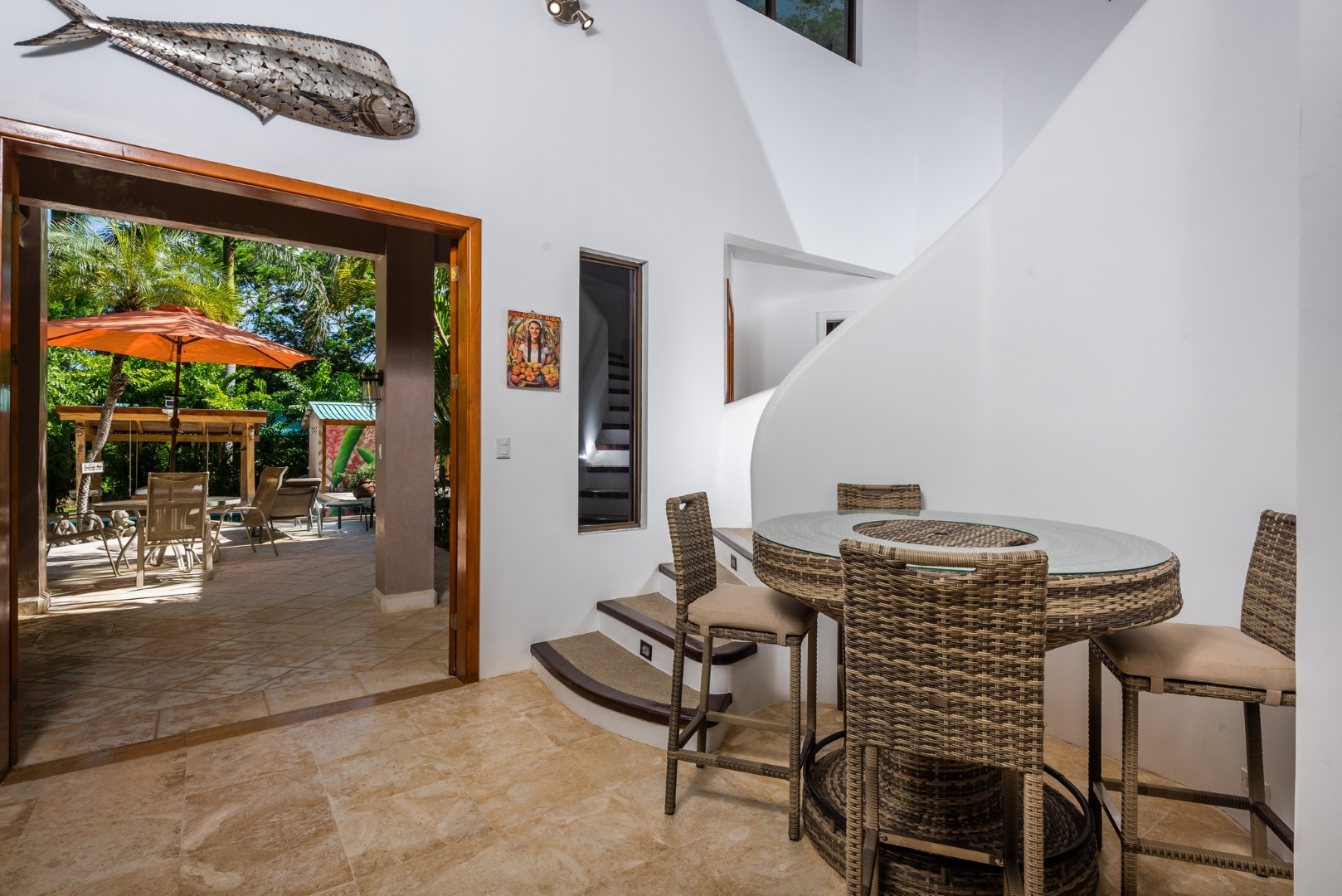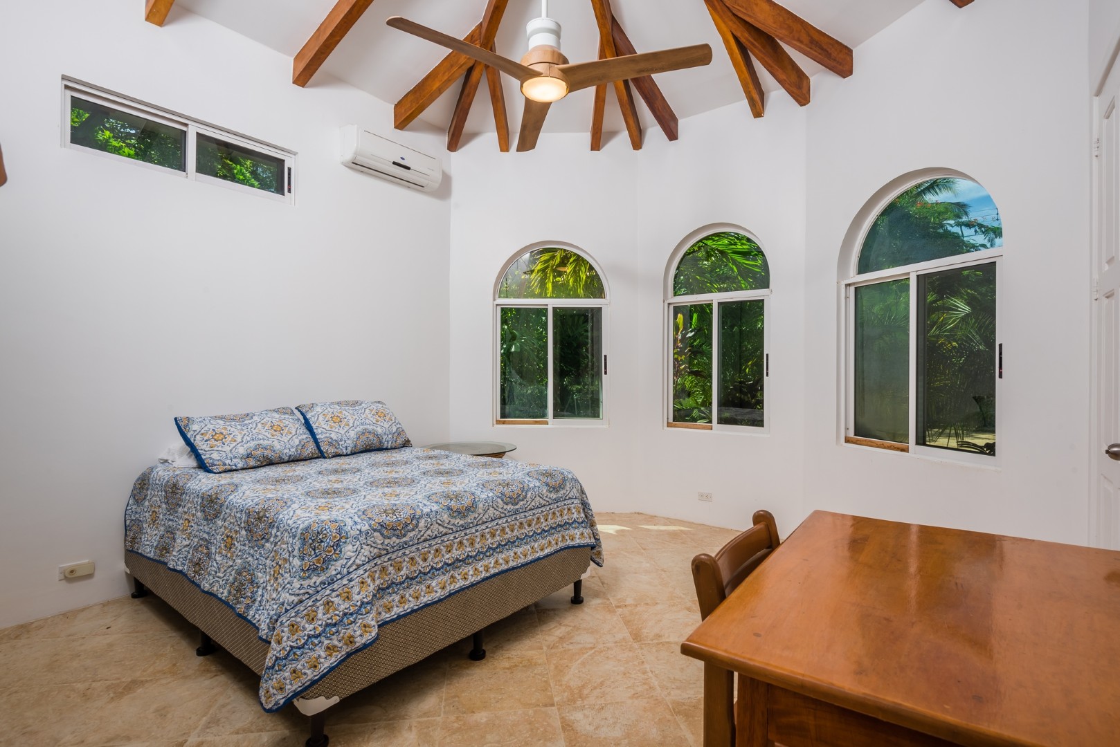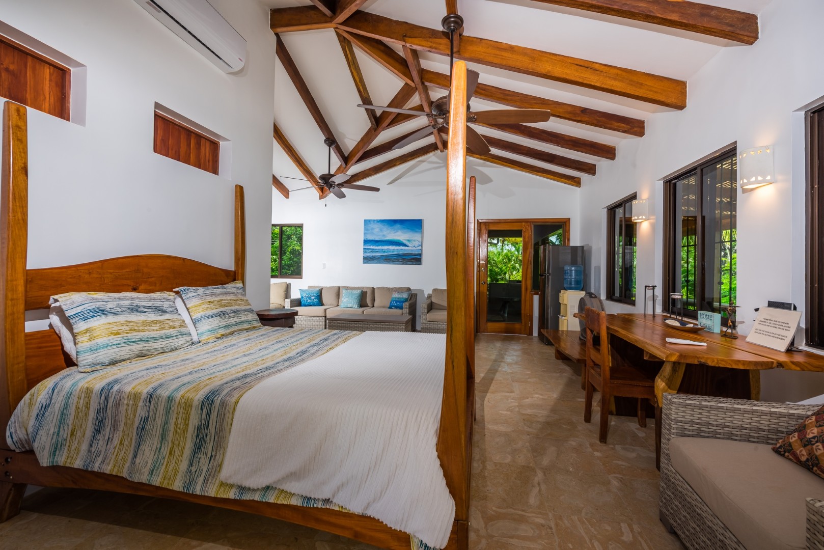 The large sweeping staircase brings you to the 2nd floor of Casa Infinity. The 3rd bedroom features a queen bed, sitting area, small refrigerator, water cooler, and air conditioning. This bedroom opens out on to a wrap around porch that offers an ocean view and birds eye view of the pool area below.