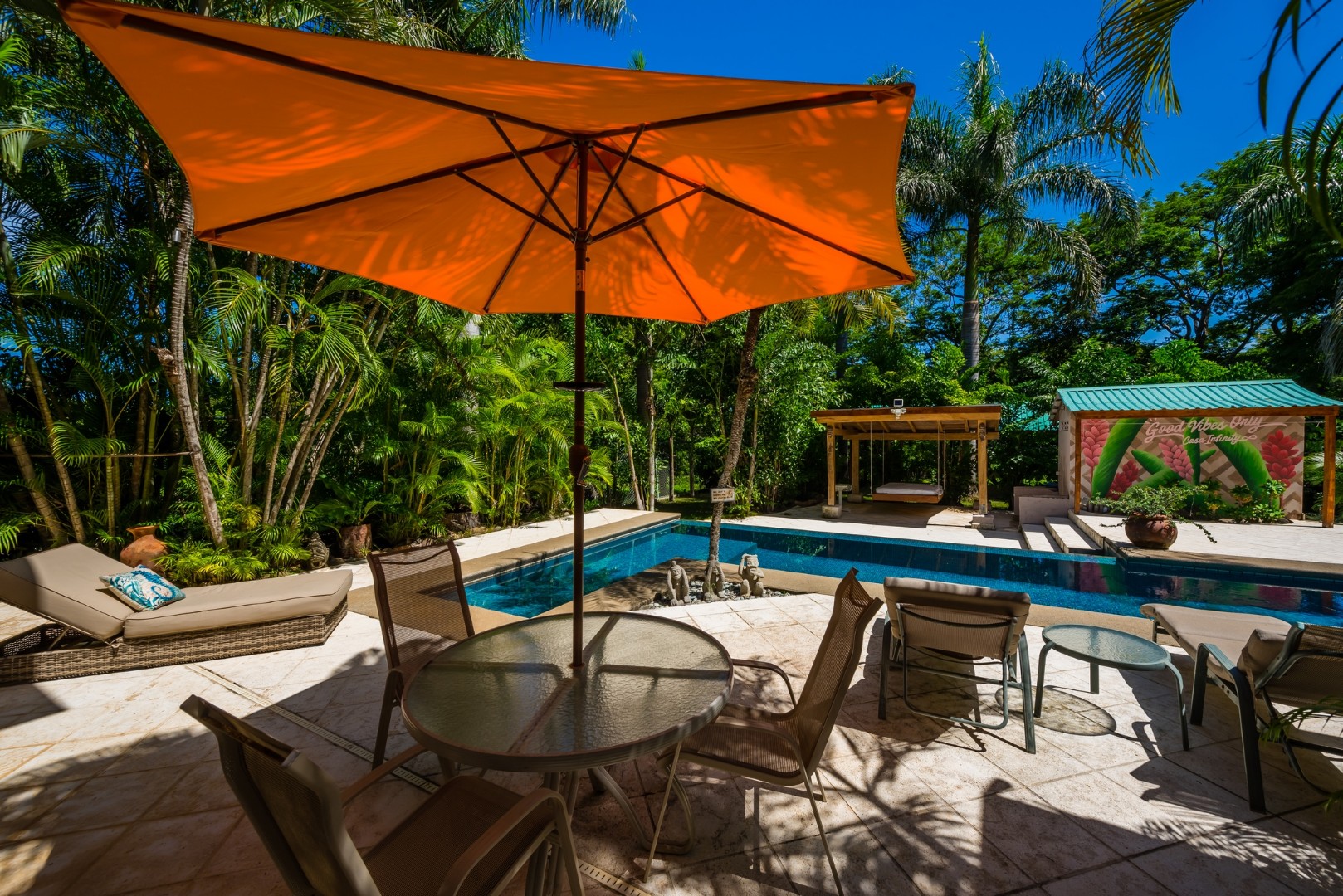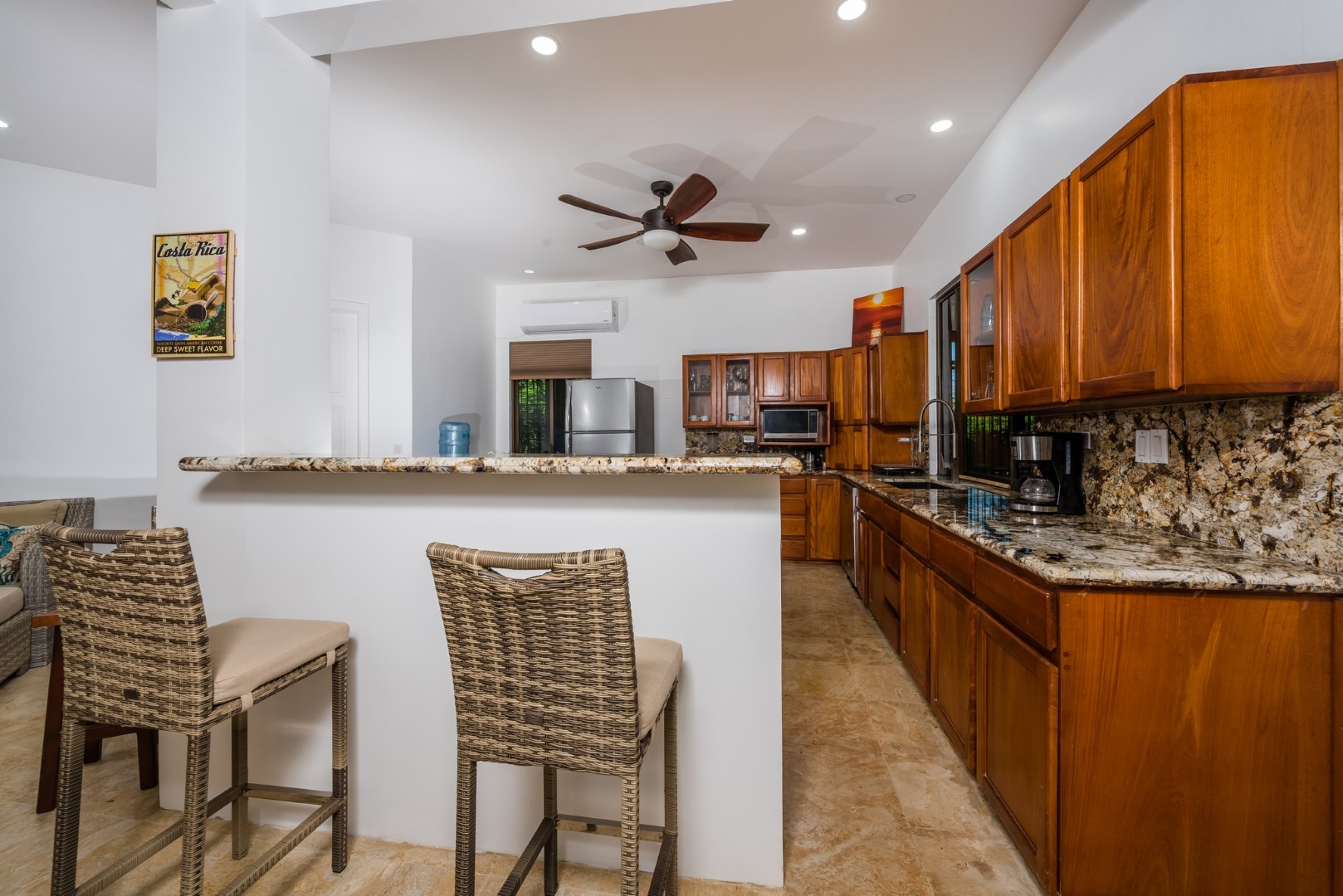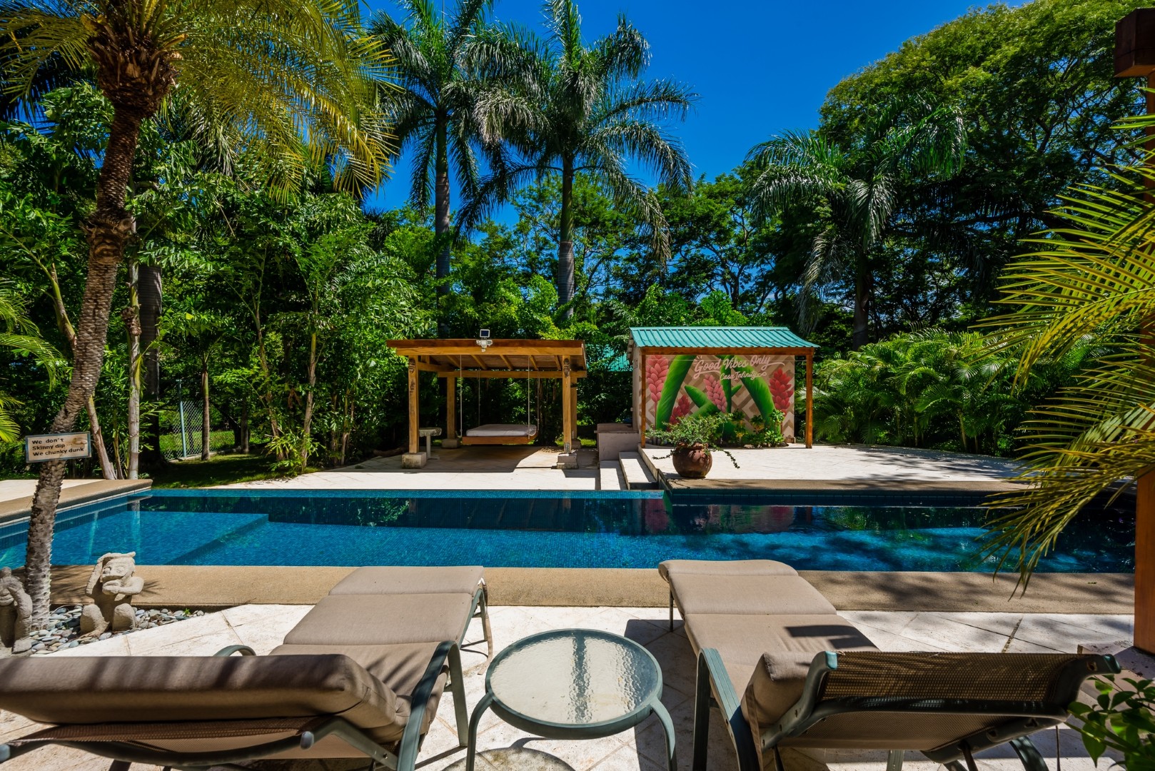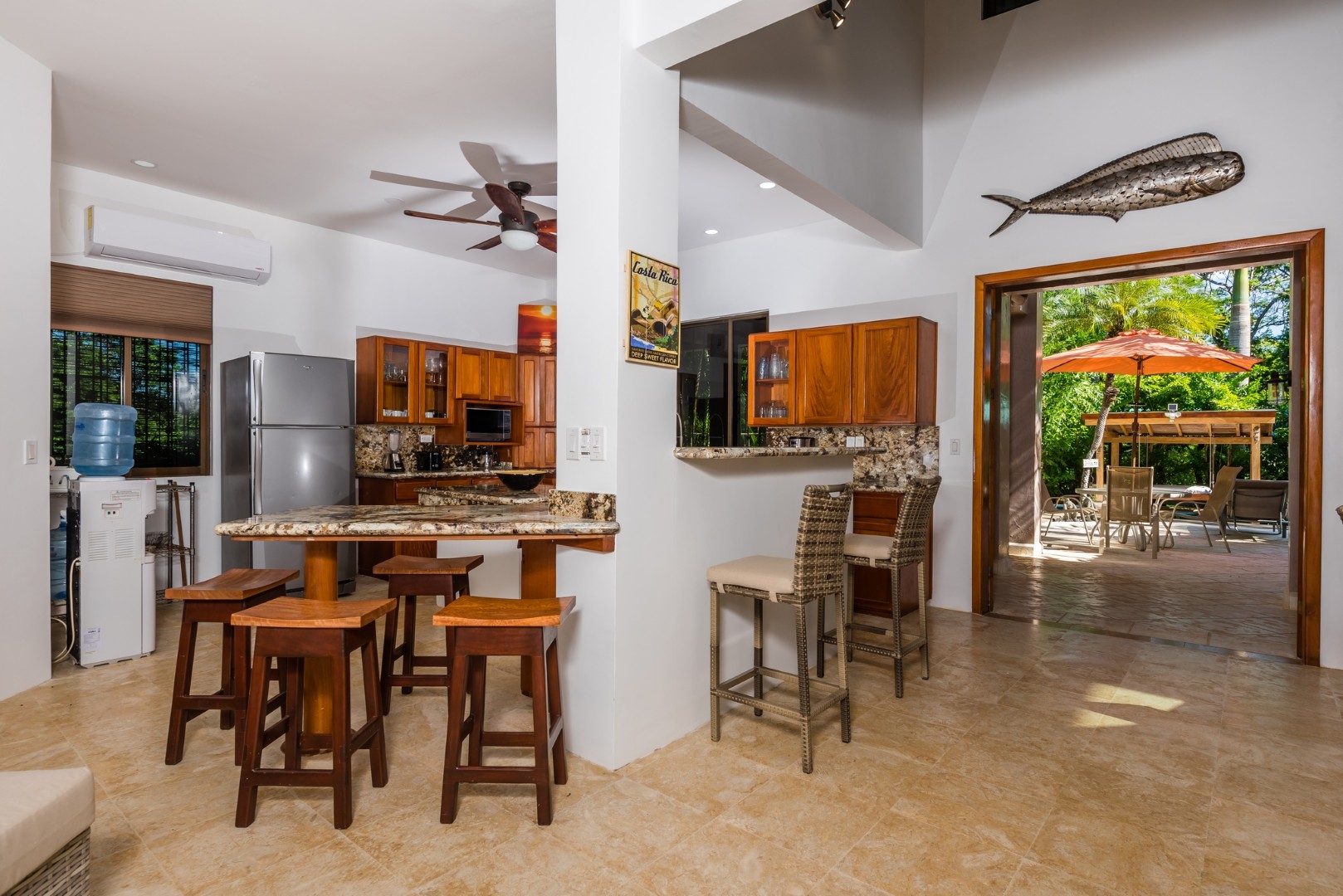As you enter the home you will find an open layout living and kitchen area which is very accommodating and comfortable. This area has a full size refrigerator, electric stove, microwave and many small appliances. The laundry room with a full size washer and dryer is located off the kitchen. These two areas open out onto a fenced in private pool area which is lushly landscaped. The pool is large and has an infinity edge that enhances the view. This outdoor living area features a large Guanacaste table and lounges to relax.