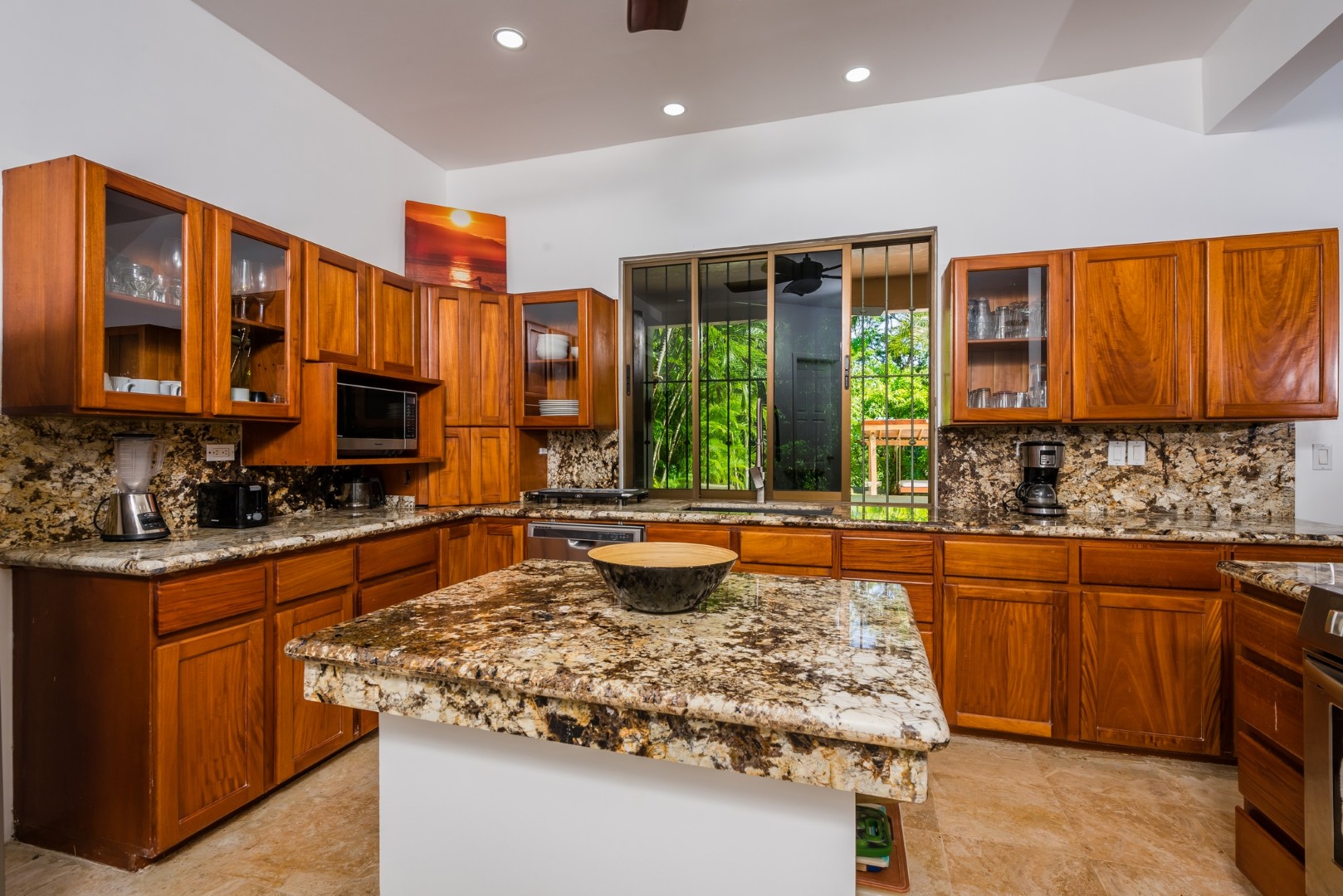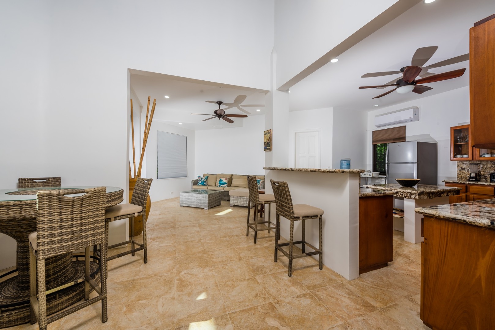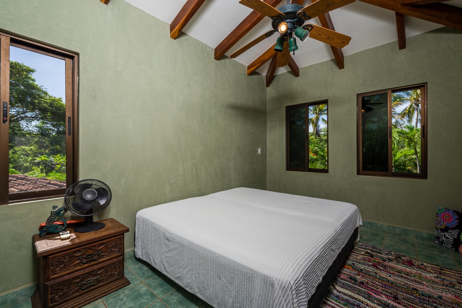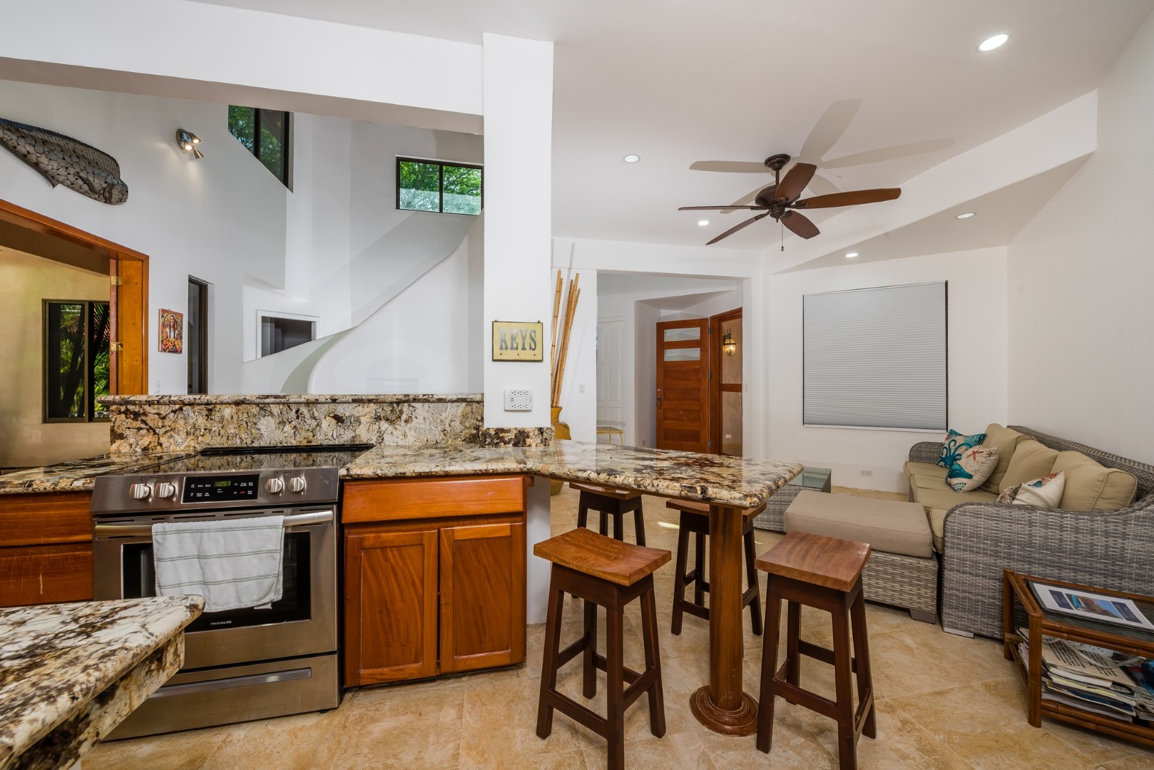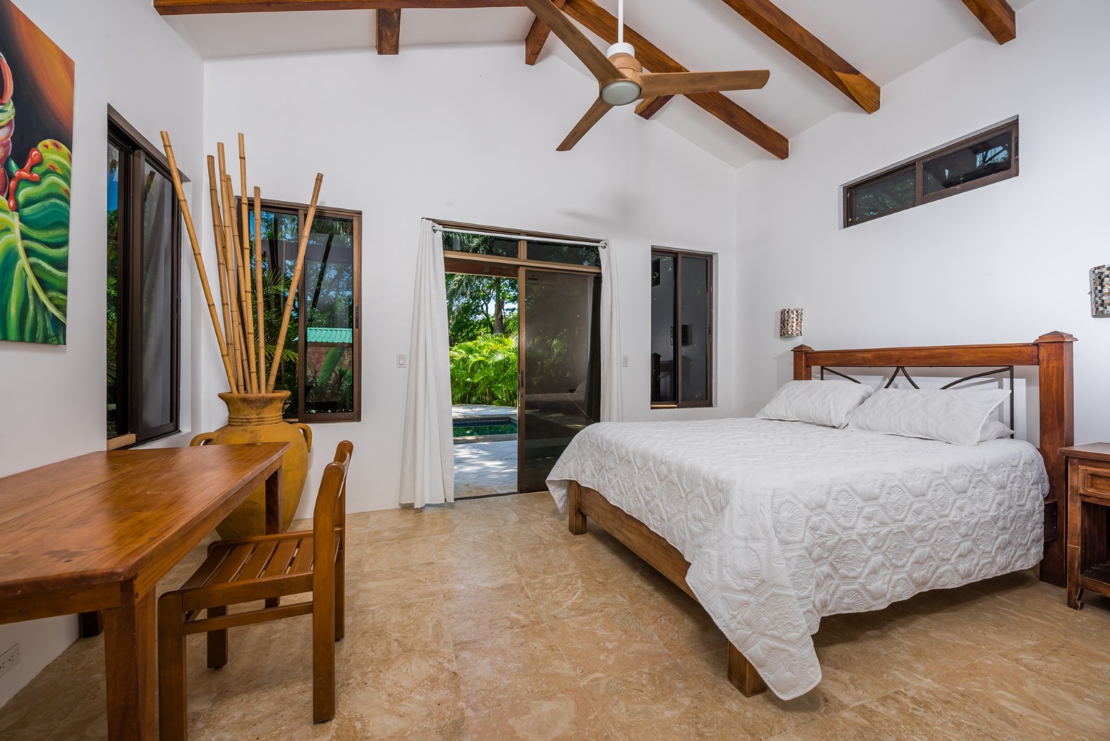 As you enter the home you will find an open layout living and kitchen area which is very accommodating and comfortable. This area has a full size refrigerator, electric stove, microwave and many small appliances. The laundry room with a full size washer and dryer is located off the kitchen. These two areas open out onto a fenced in private pool area which is lushly landscaped. The pool is large and has an infinity edge that enhances the view. This outdoor living area features a large Guanacaste table and lounges to relax.